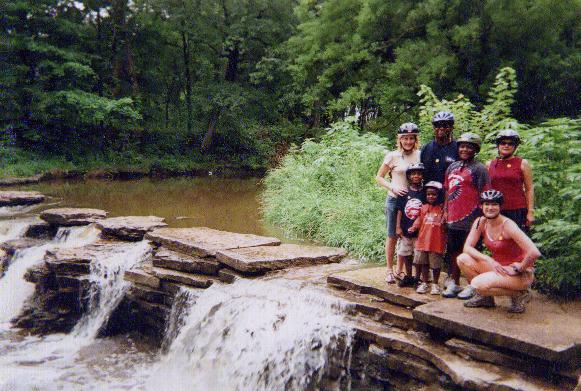 Pausing for a photo at the waterfall during the 2008 Scott Orlowski Memorial Bike/Walkathon are (left to right): Diane Wood, Clark & Jack Elliott, John Elliott, Grant Elliott, Michele Gallo and Jennifer Miller.