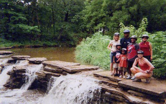 Pausing for a photo at the waterfall during the Bike-a-thon are (left to right): Diane Wood, Clark & Jack Elliott, John Elliott, Grant Elliott, Michele Gallo and Jennifer Willard.